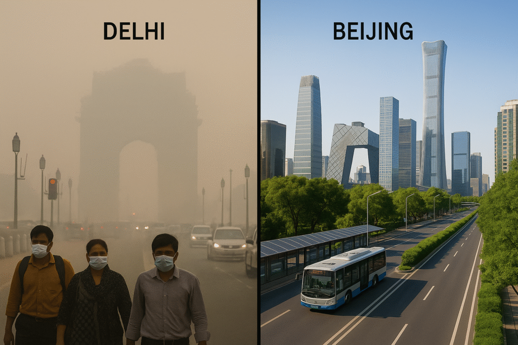 2024 तक Beijing का average AQI 80-90 के बीच रहता है, जबकि Delhi का 300+।
