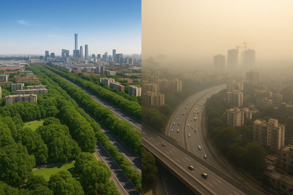 Beijing और Shanghai में government ने “Green Belt and Buffer Zone” policy अपनाई. उन्होंने लाखों trees लगाकर highways और industrial zones को residential areas से अलग किया. Urban planning में ventilation corridors बनाए गए ताकि हवा freely circulate करे।